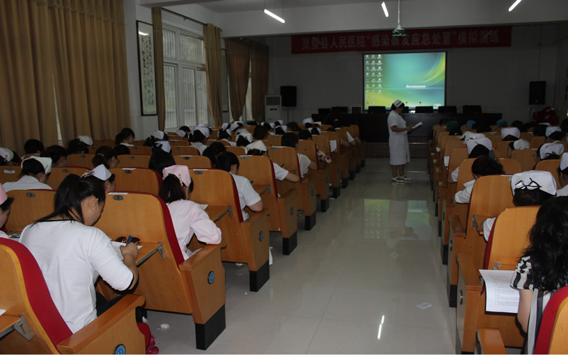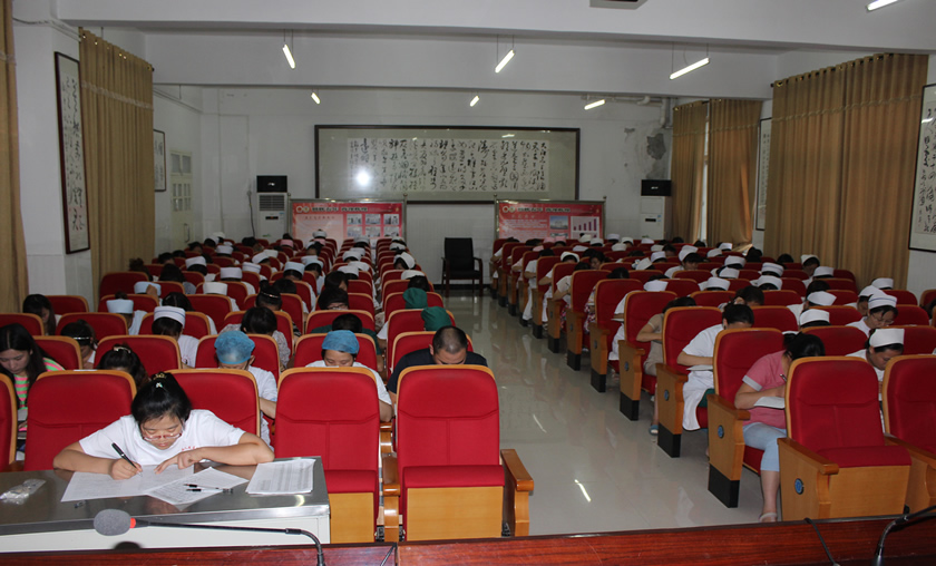 灵璧县人民医院总护理部于2013年9月4日在本院大会议室对全院护士分两批进行“三基理论”考试,此为考试现场,护士们正在认真答题。