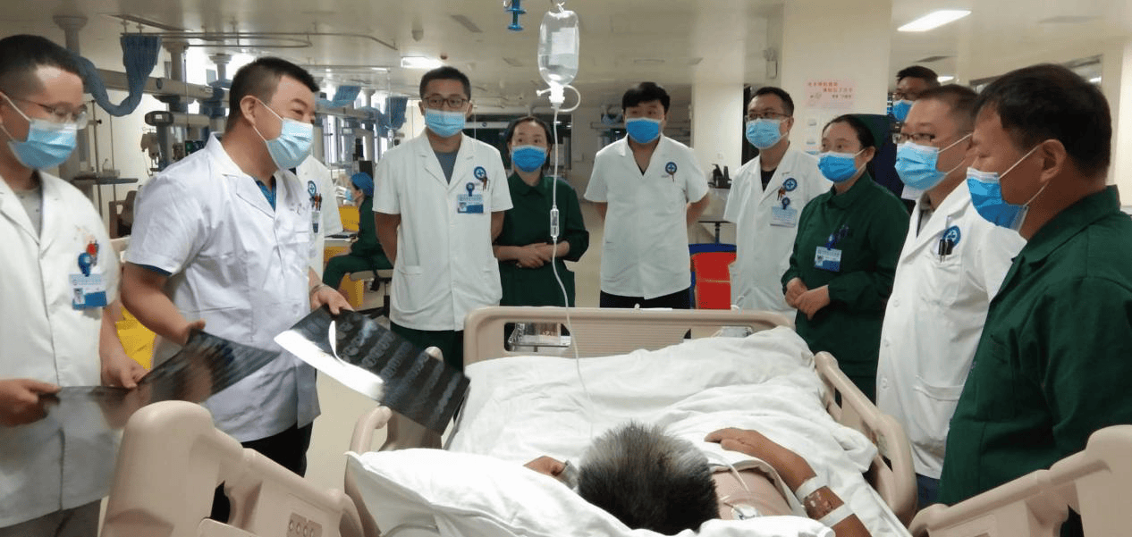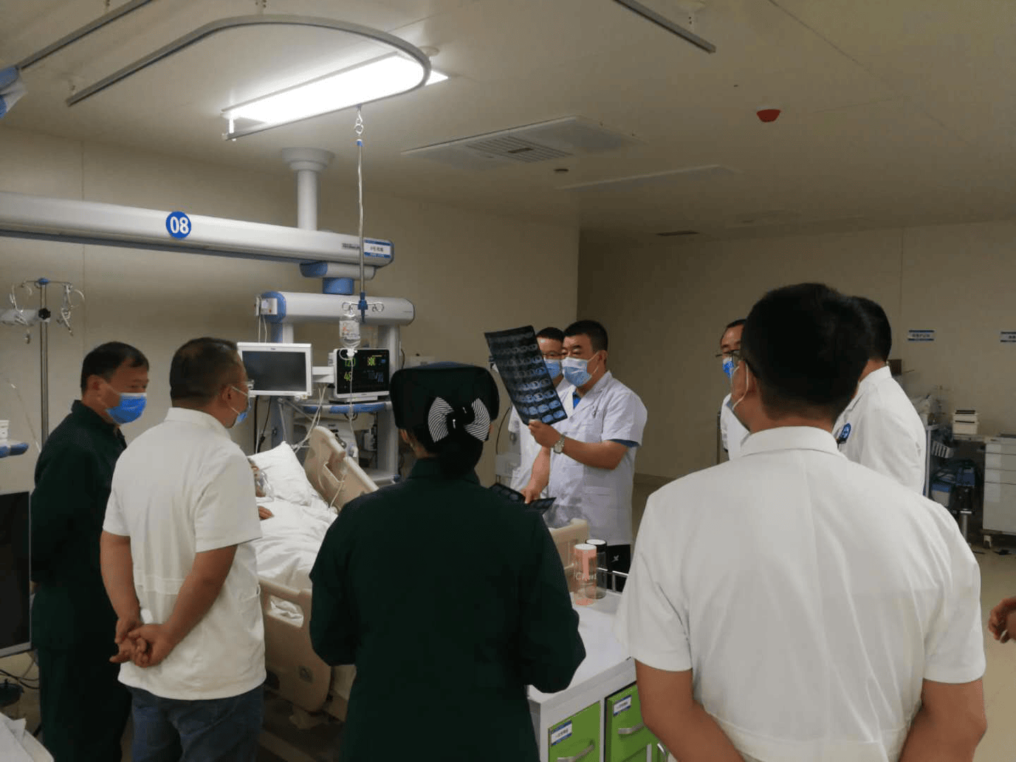 李文放教授带领ICU医护人员查房,床边指导具体病人的诊疗,查找病因,制订明确诊疗方案。