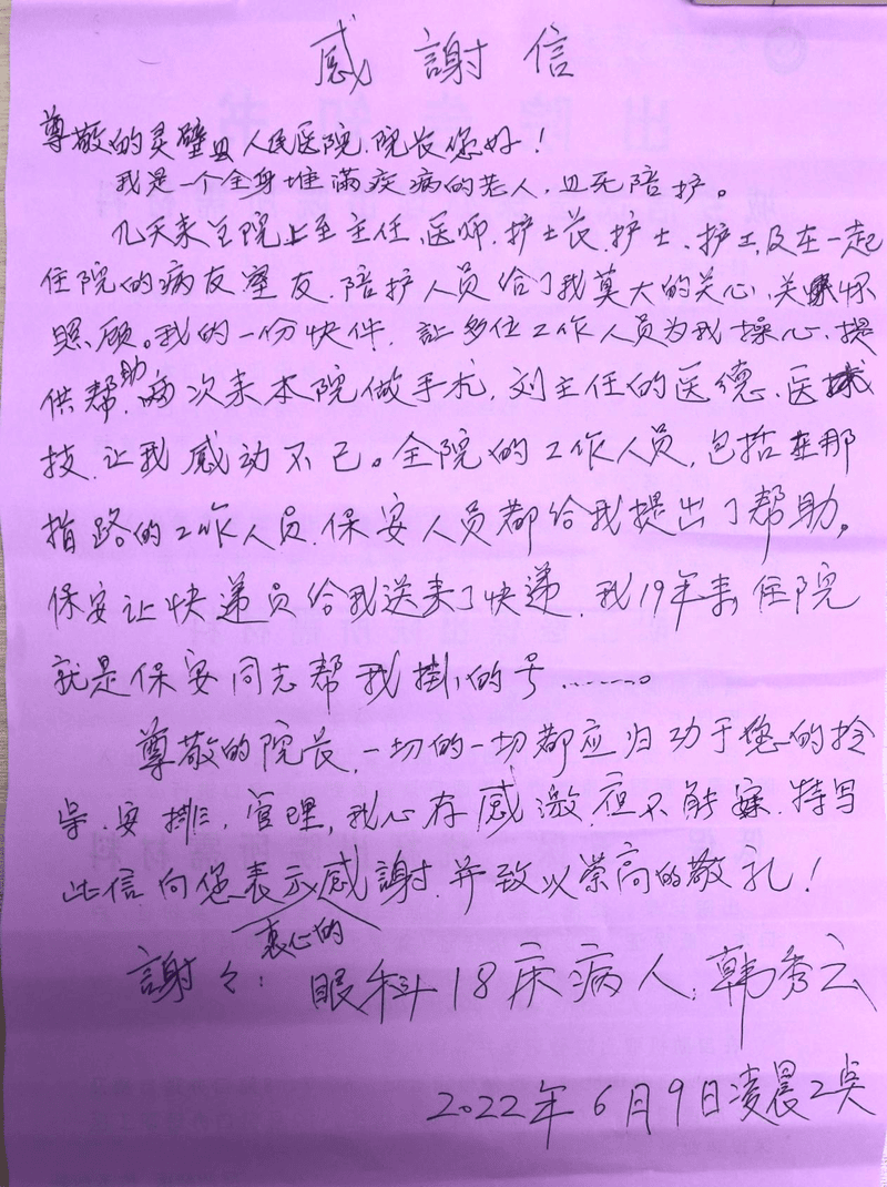 69日,灵璧县人民医院眼科病房内,一名患者将亲手书写的感谢信交到刘侠主任手中。她希望刘侠主任将该信转交给院长。信中表示住院期间她得到了全体医务人员包括护工、病友、陪护人员的莫大的关心、关怀和照顾,刘侠主任的医德医术让她感动不已,并把一切的一切都归功于院长的领导、安排和管理。对此,她心存感激,夜不能寐,特写此信向院长表示衷心的感谢。
