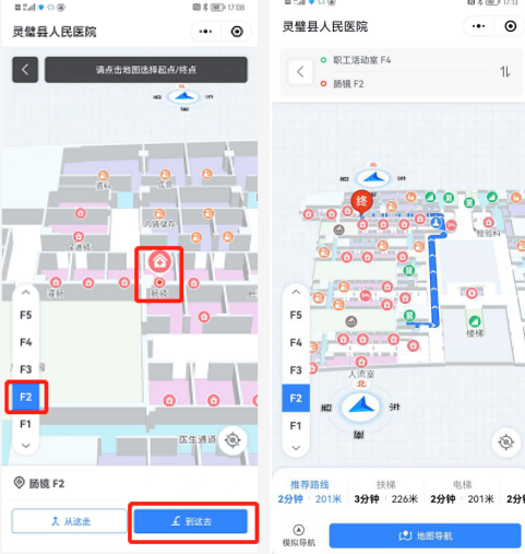 患者如果需要去往其他楼层的某个科室,可以在导航里找到该科室位置,直接点击科室名称,比如从4楼的某位置,到2楼的肠镜室,可以在地图上依次点击“F2”“肠镜”“到这去”