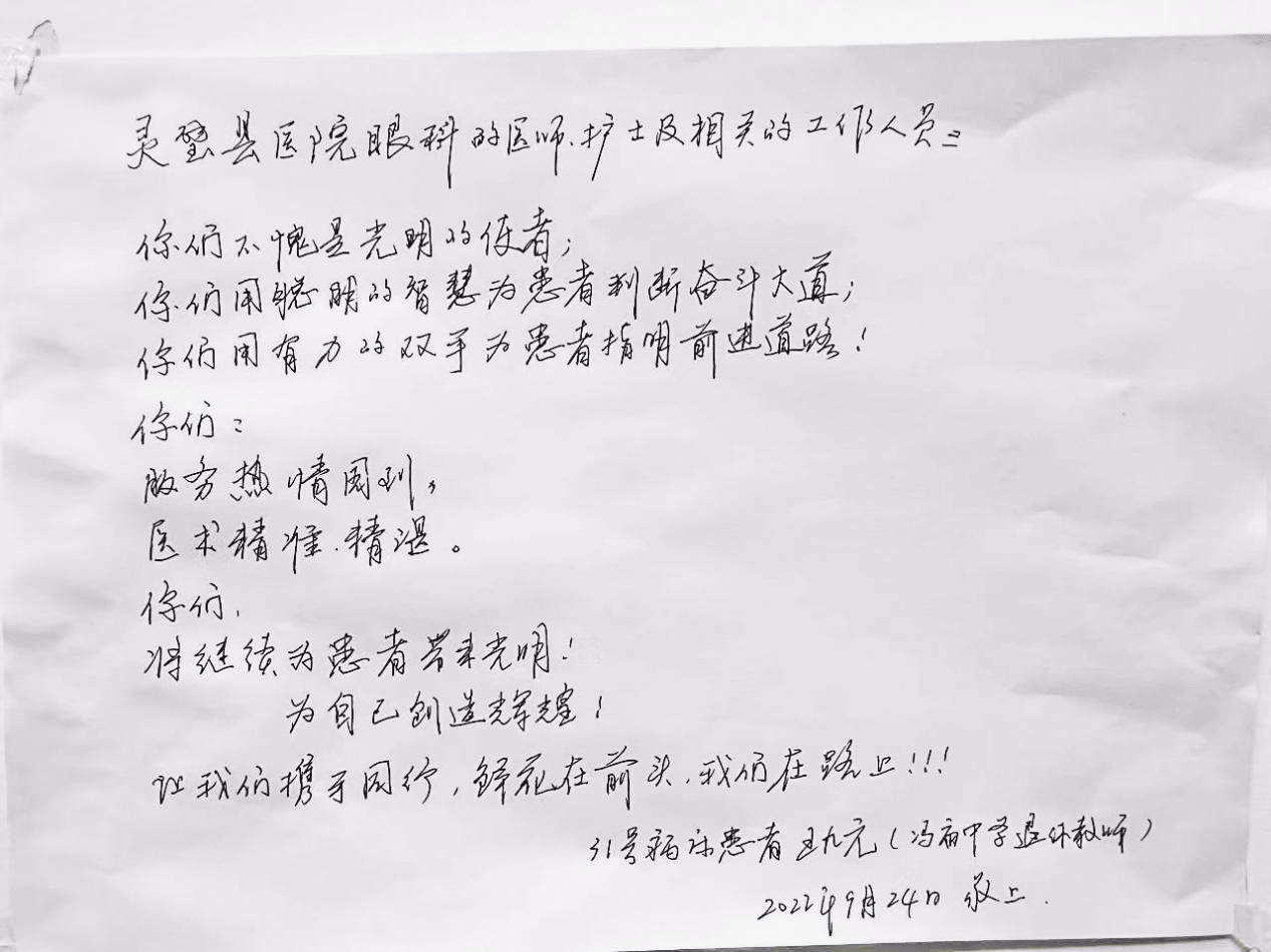 首页>医院动态>院级新闻>灵璧县人民医院眼科31床患者:“你们不愧是光明的使者”