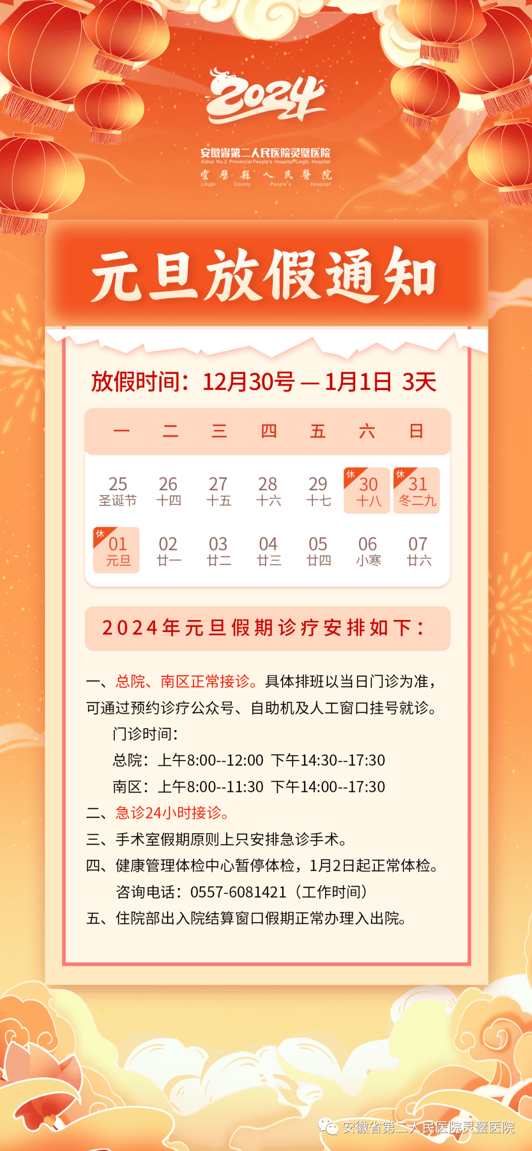 安徽省第二人民医院灵璧医院2024年元旦假期诊疗工作安排