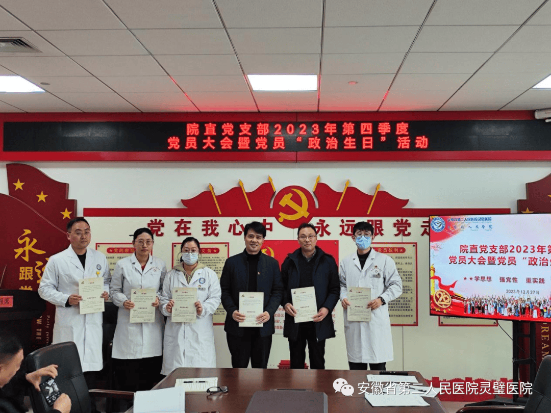 为进一步强化党建引领,增强党员的归属感、荣誉感和凝聚力,引导广大党员干部强化宗旨意识和责任意识,时刻牢记党员“第一身份”,切实发挥党员先锋模范作用。12月27日,院直党支部组织开展第四季度党员大会,为10-12月入党的党员同志过“政治生日”。同时以观看一次身边榜样先进事迹视频、赠送一张生日贺卡、重温一次入党志愿书、分享一段入党感悟、为新党员佩戴一次党徽、重温一次入党誓词等内容,让全体党员追忆初心使命,永葆党员本色。 全体党员首先认真观看了《一路芳华映初心》身边榜样吴秋瑾同志专题片。随后,党委书记张浩同志为过“政治生日”的党员同志赠送印有“入党誓词”、“生日寄语”的“政治生日”贺卡,简单朴素的贺卡承载着党组织对每名党员的殷切期盼,让大家感受特殊的“生日”温暖。活动中,党员代表重温“入党志愿书”、分享入党感悟,同时为新党员佩戴党徽。在鲜红党旗的映照下,全体党员面向中国共产党党旗,右手举拳庄严宣誓,重温入党誓词,彰显了全体党员坚定的理想信念。 活动最后,党委书记张浩同志为过“政治生日”的党员同志送上了祝福寄语,同时希望每名党员要始终牢记初心使命,发挥“一名党员就是一面旗帜”先锋模范作用,把此次党员“政治生日”活动作为新的开端、新的起点,始终牢记自己的第一身份是共产党员、第一职责是为党工作,立足岗位实际,时刻不忘自己应尽的义务和责任,为推动医院高质量发展作出新的更大贡献。 通过这次“政治生日”活动,不仅让党员感受到来自党组织的温暖关怀,还对党员进行一次深刻的党性教育。党员们表示,要把这次党员“政治生日”作为新的开端,始终牢记自己的第一身份是共产党员、第一职责是为党工作,坚定信念、强化担当,用实际行动发扬党员先锋模范带头作用。
