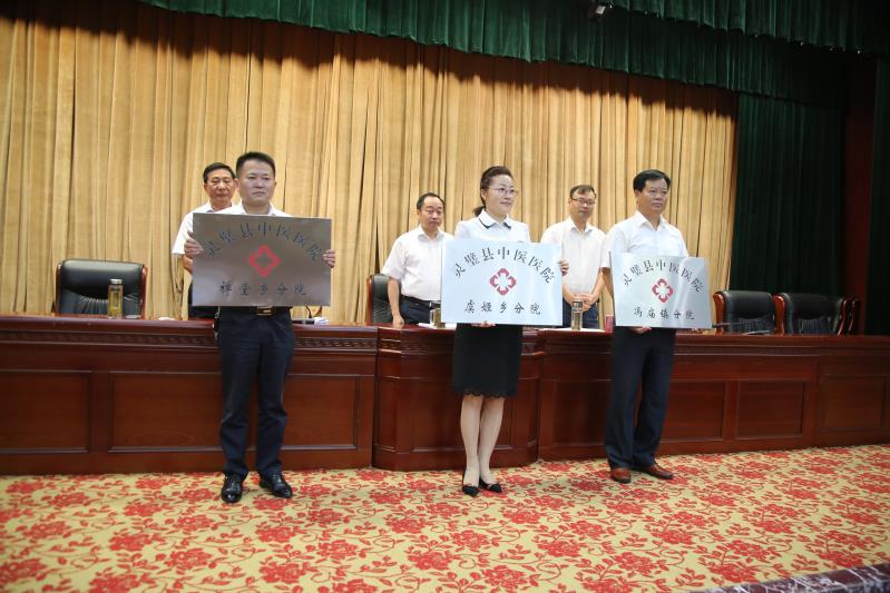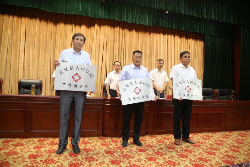 第二项议程:授牌仪式。县委书记刘博夫、副县长张安文、县卫健委书记、主任李先宏分别对灵璧县人民医院、灵璧县中医医院分别牵头和基层医疗卫生机构组建的两个紧密型县域医共体进行授牌。