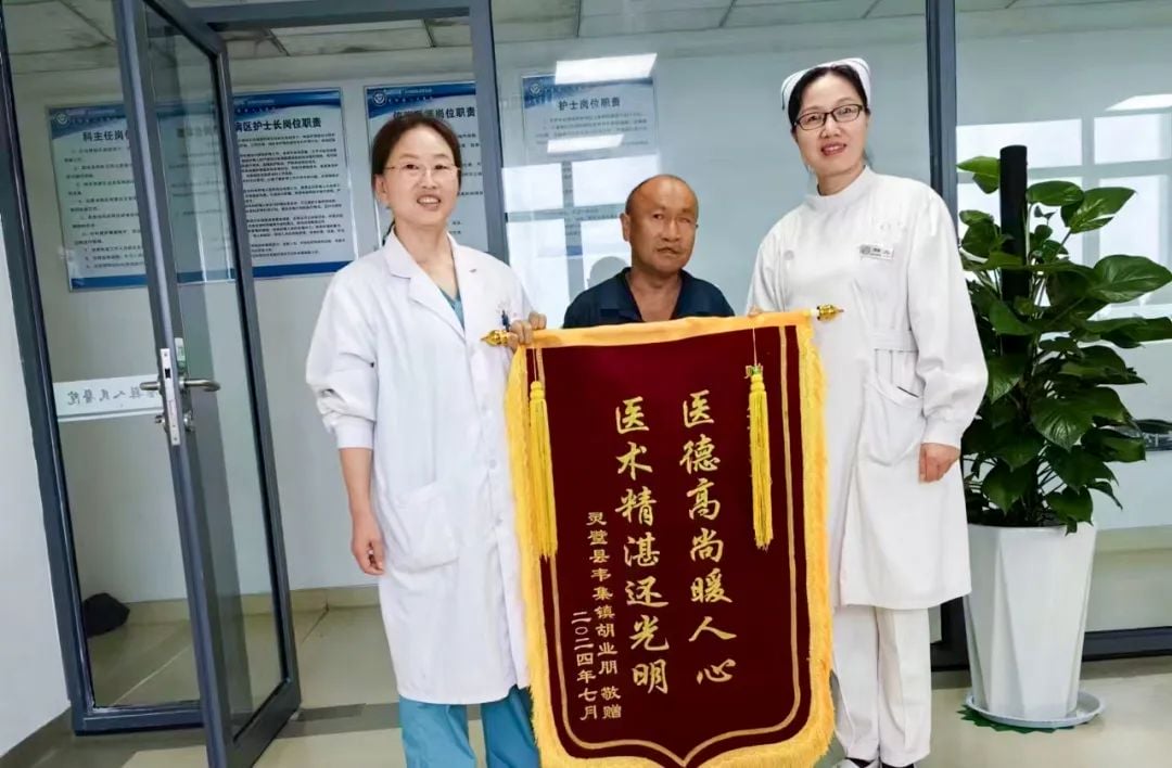 7月9日上午,灵璧大雨,出院患者胡先生冒着风雨从老家赶来为眼科全体医护人员送上锦旗,感激他们悉心照顾,使其重见光明。锦旗上绣有“医术精湛送光明,医德高尚暖人心”的字样,这是对眼科全体医护人员优质服务的最好肯定。