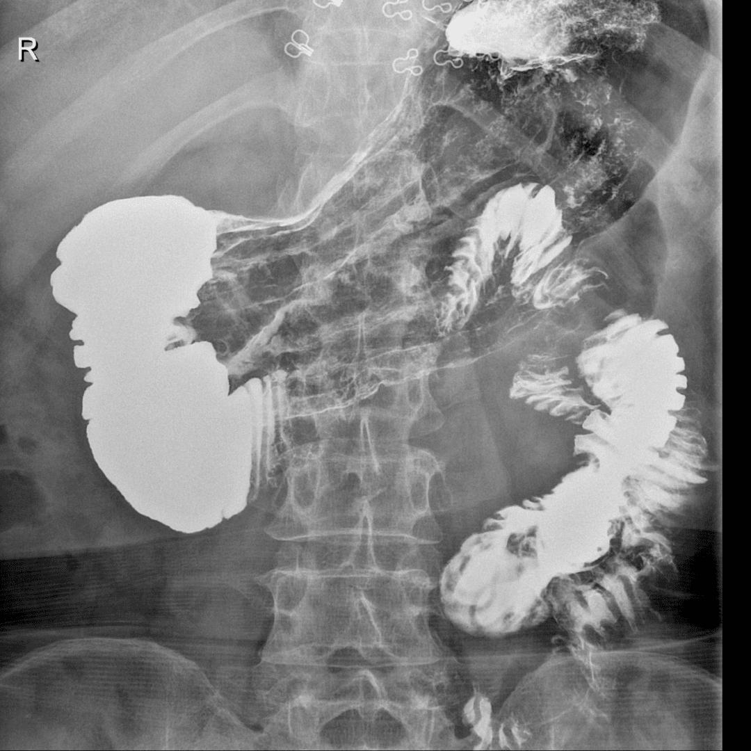 诊断:肠系膜上动脉压迫综合症。外科给予十二指肠空肠吻合术。