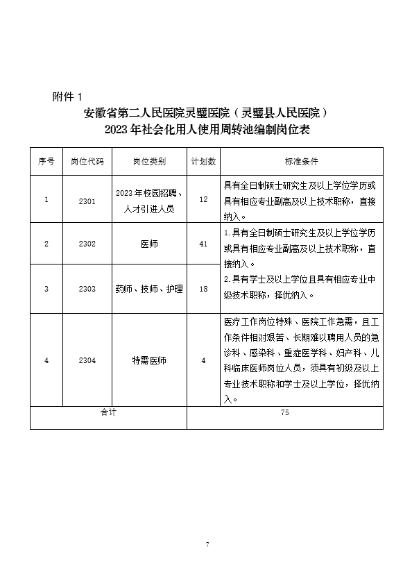 根据《关于宿州市公立医院周转池编制使用计划备案的通知》(皖编办周转池函〔2023〕134号),县人民医院2023年可使用周转池编制75名,具体流转岗位及职数见附件1。