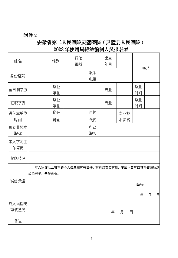 附件2:安徽省第二人民医院灵璧医院(灵璧县人民医院)2023年使用周转池编制人员报名表