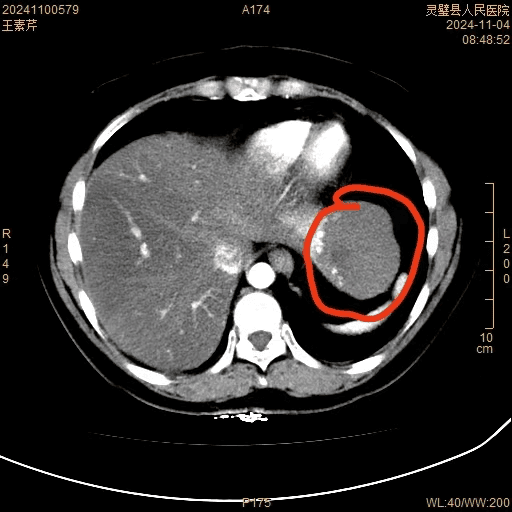 患者53岁腹胀恶心20余年,一直保守治疗2天前于外院体检时发现左隔下脾胃前上间隙内团块软组织密度影,与肝左叶分界不清患者及其家属我院普外三科寻求进一步治疗