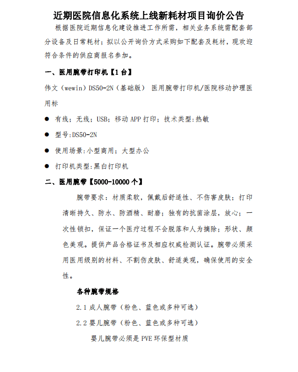 近期医院信息化系统上线新耗材项目询价公告