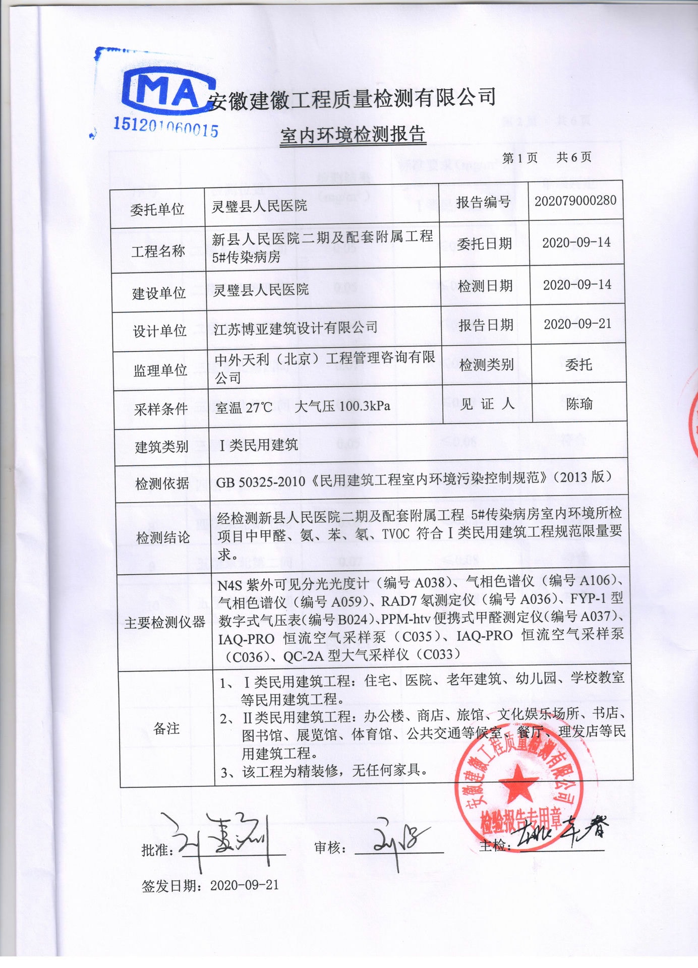 灵璧县人民医院二期及配套附属工程5#传染病房工程室内环境检测报告公示