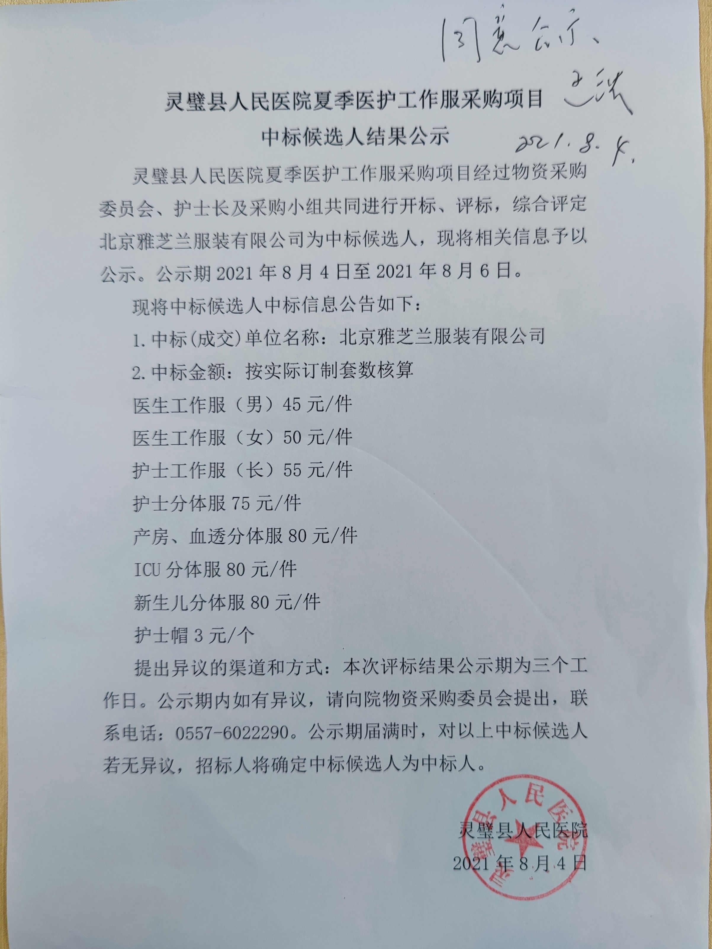 灵璧县人民医院夏季医护工作服采购项目中标候选人结果公示