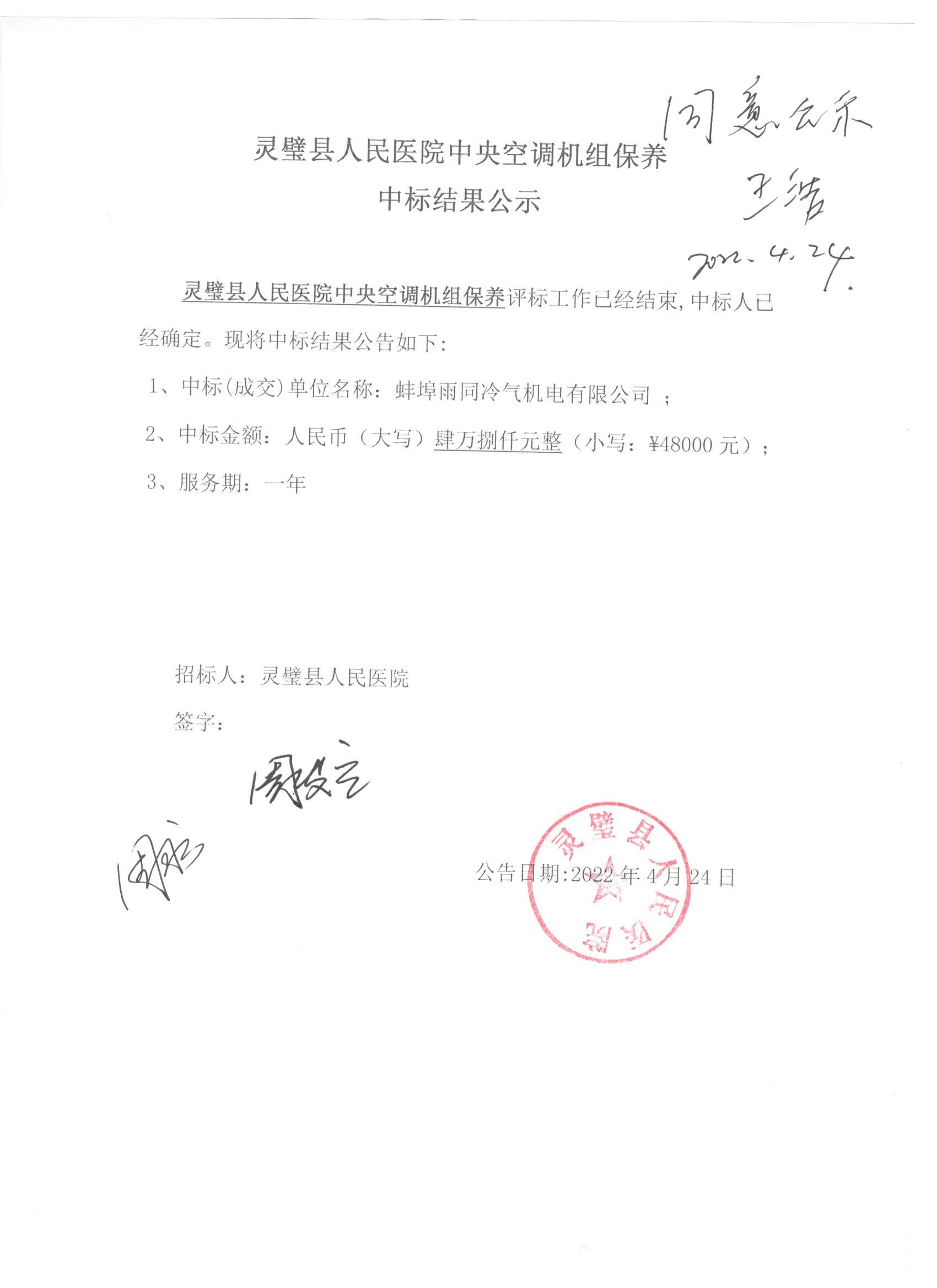 灵璧县人民医院中央空调机组保养评标工作已经结束,中标人已经确定。现将中标结果公告如下: