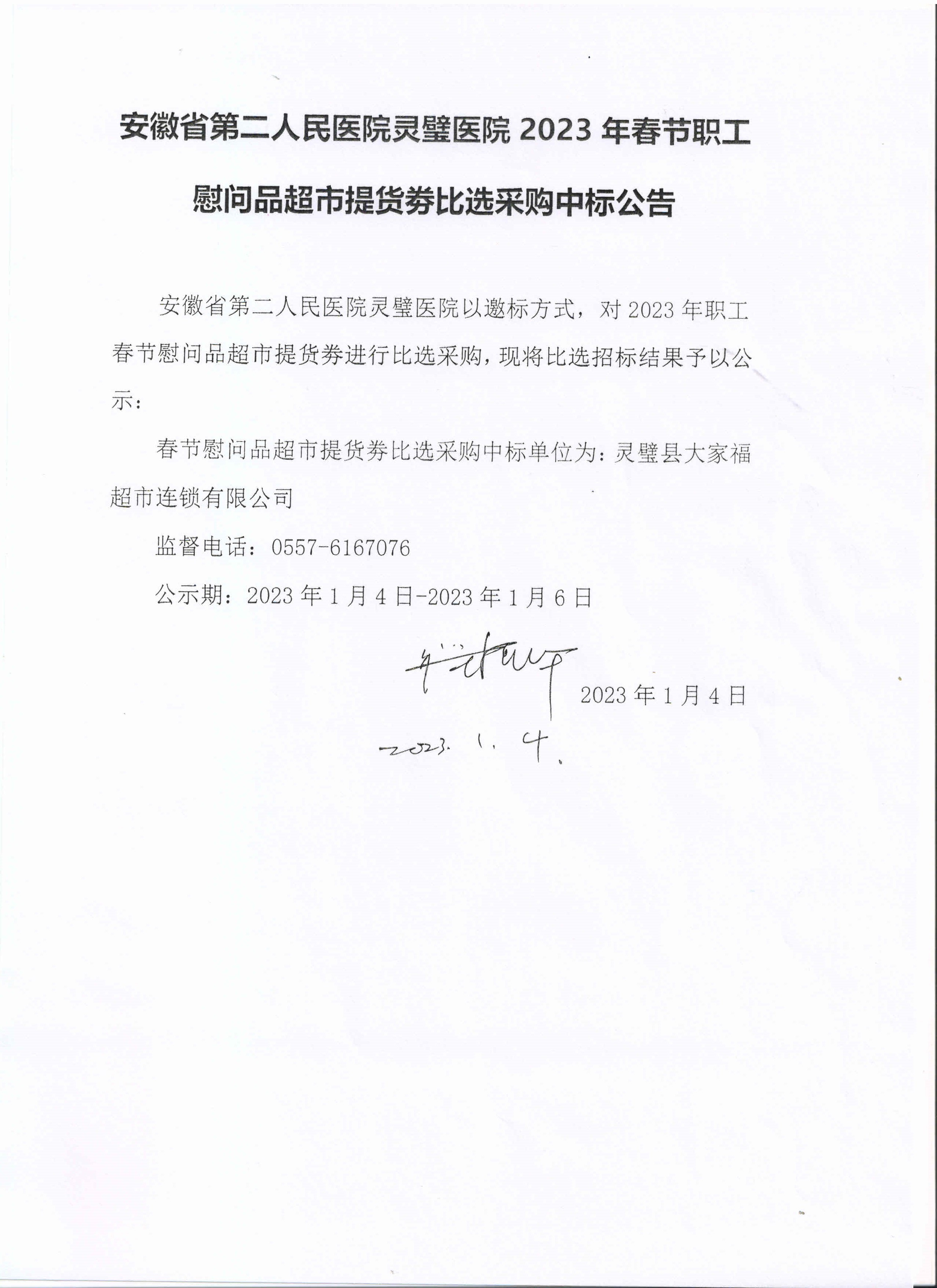 来源:安徽省第二人民医院灵璧医院2023年春节职工慰问品超市提货券比选采购中标公告
