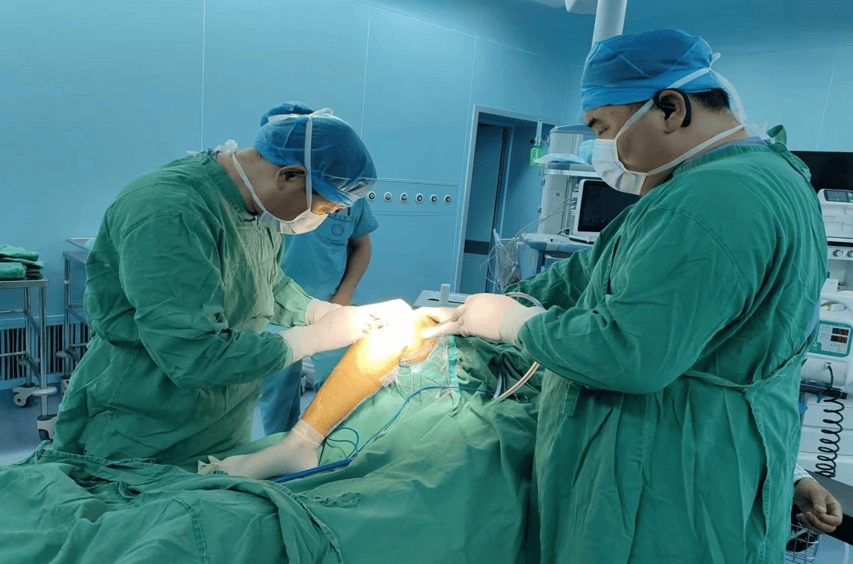 图为我院骨科专家配合喻德富副院长行膝关节单髁置换+骨囊变切除骨水泥填塞手术治疗