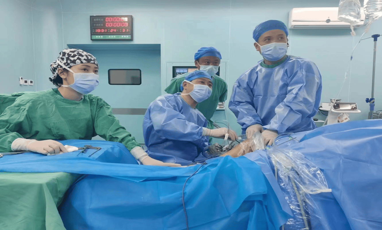 图为喻德富副院长在为患者实施微创膝关节镜下半月板成形术。