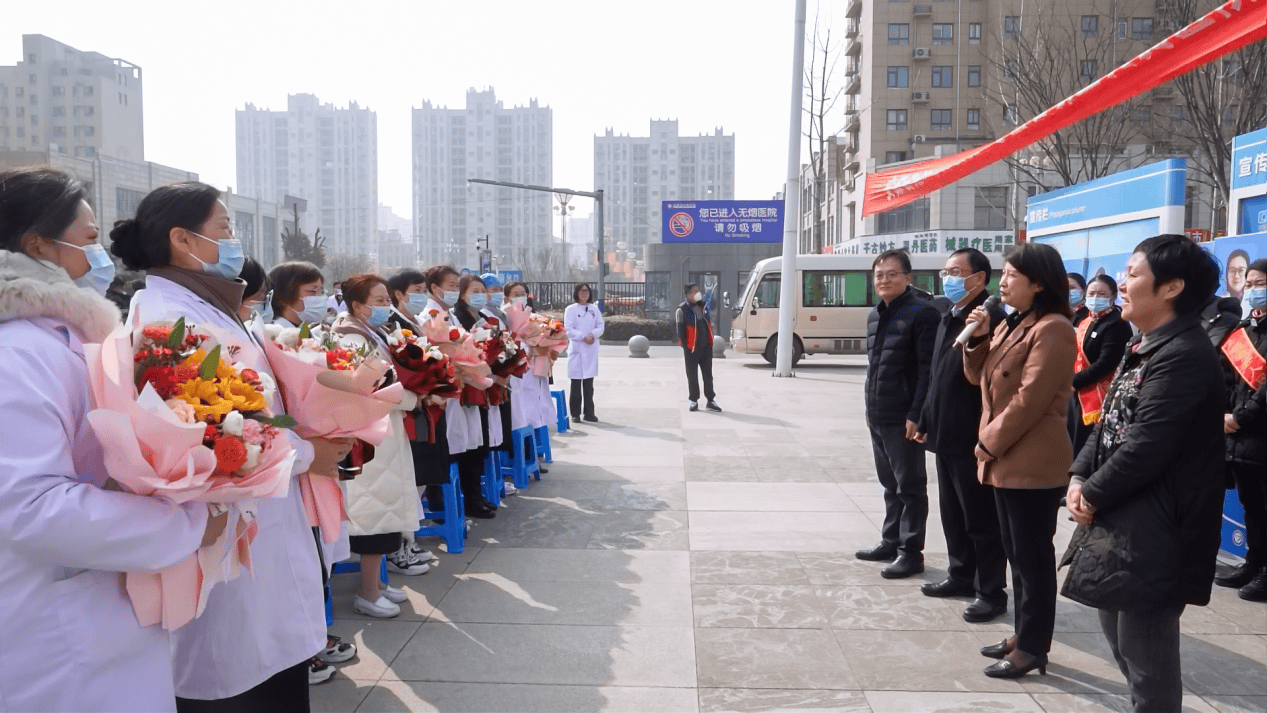 图为县委常委、副县长晋军向义诊女医生代表送上鲜花和节日问候