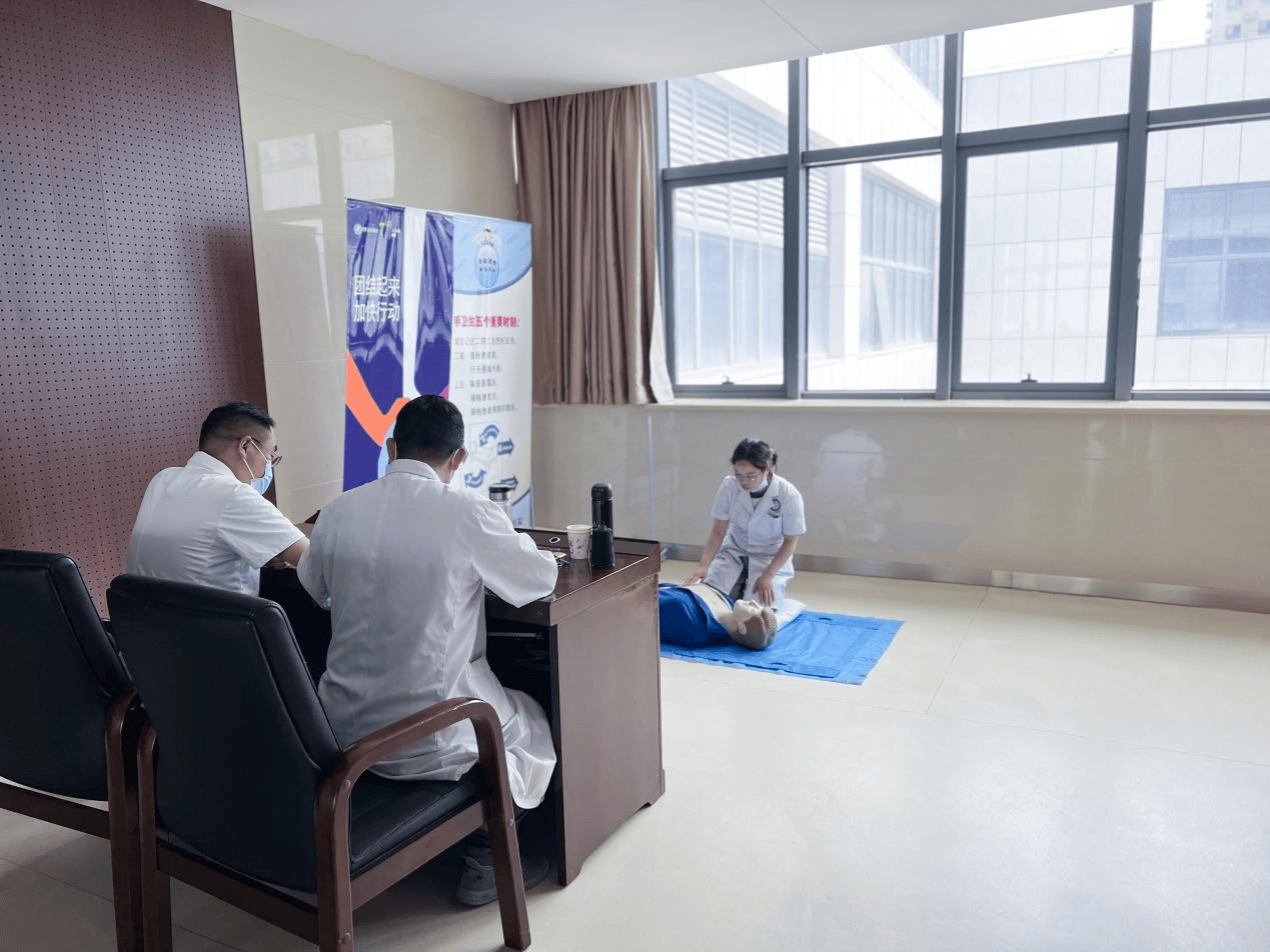 本次培训考核内容主要包括单人心肺复苏等,授课专家耐心细致地为大家讲解了心肺复苏操作要点,并通过模拟人操作进行了实体培训。医务科组织7名专家现场监考,各监考老师严格按照标准进行打分,参加考核人员合格率100%。