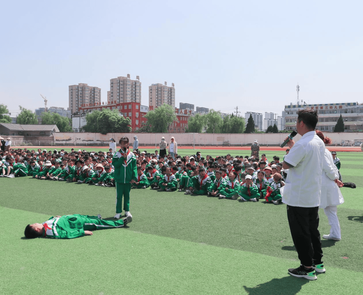 “如何正确拨打“120”,我们只要记清三要素……”,“假如你发现有人落水,我们该怎么施救呢?”现场,院前急救科护士长尹晓敏,护士刘雅文给同学们讲解了正确拨打“120”,溺水施救措施,希望同学们在需要拨打“120”情况下做到沉着冷静不慌张,记清地址、病情和电话,原地等待不要怕;溺水施救牢记“叫、叫、伸、抛”正确施救更安全。
