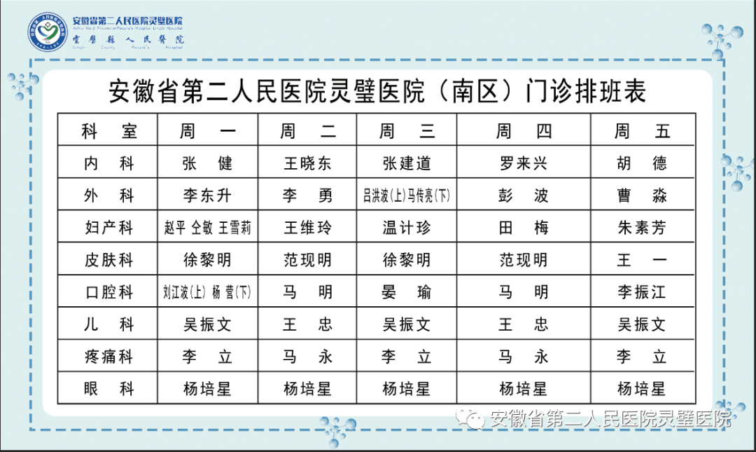 安徽省第二人民医院灵璧医院(南区)门诊排班表