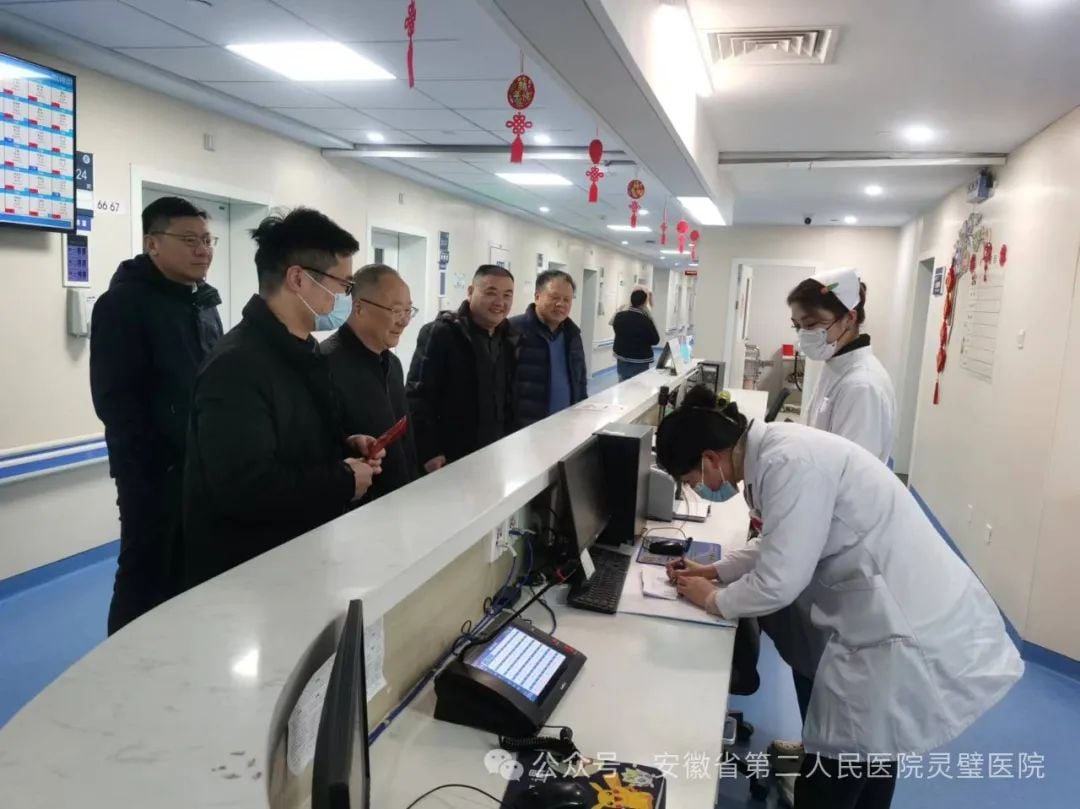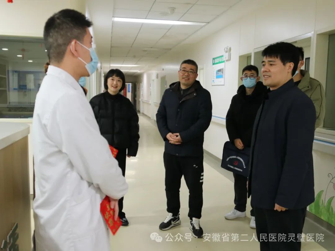 除夕夜,岁寒情暖。安徽省第二人民医院灵璧医院党委书记张浩,纪委书记蒋兴良,副院长胡正宽分别带队深入全院各科室进行节日慰问,向值班值守的医务人员送上亲切问候和新春的祝福,让在岗位上守岁迎新的医务人员倍感温暖。“晚饭吃了吗?”,“大家辛苦了”,“给大家拜年了,祝大家新年快乐!” 每到一处,院领导都送上关心关怀和满满的祝福,详细了解住院病人和科室工作情况,感谢大家舍小家为大家,坚守在一线。院领导叮嘱大家,春节期间要继续保持医者本心,为每一位患者提供温情、细致、耐心的医疗服务。也要在做好患者救治工作的同时,保重身体,注意劳逸结合,为广大群众的生命健康提供更加坚实的医疗保障。 声声祝福语,浓浓关怀意。值班值守的医务人员也纷纷向院领导互赠祝福,同时表示,请领导放心,一定坚守岗位,立足本职,全力保障春节期间服务质量和医疗安全,确保度过一个平安祥和的春节。