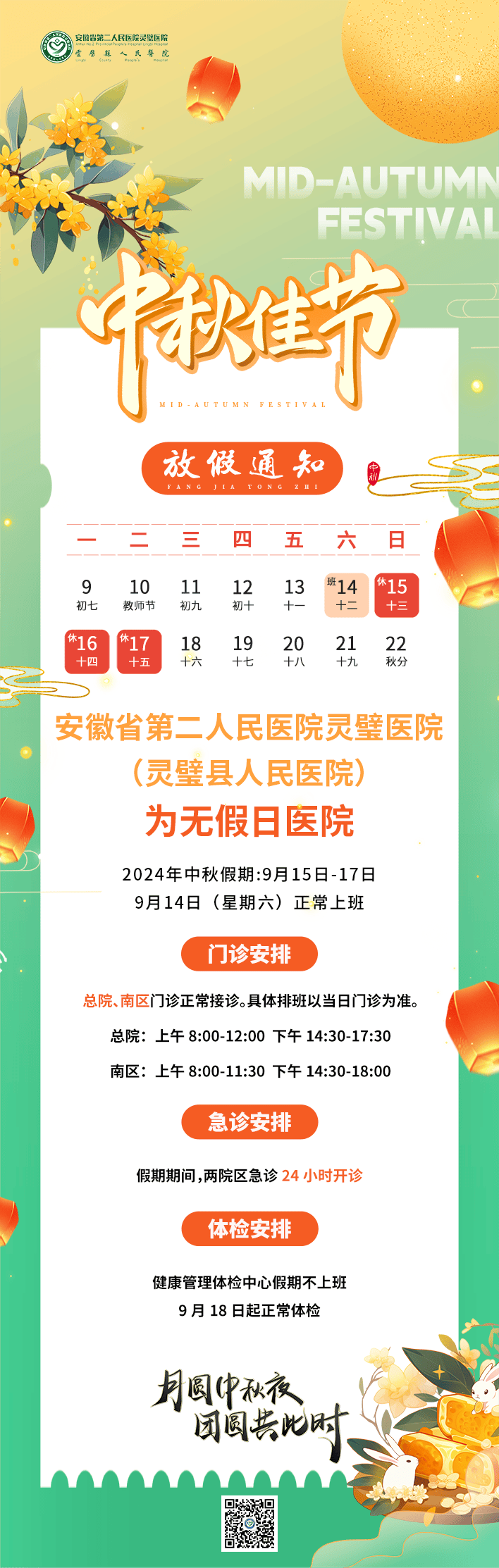 安徽省第二人民医院灵璧医院(灵璧县人民医院)2024年中秋假期门、急诊及体检安排