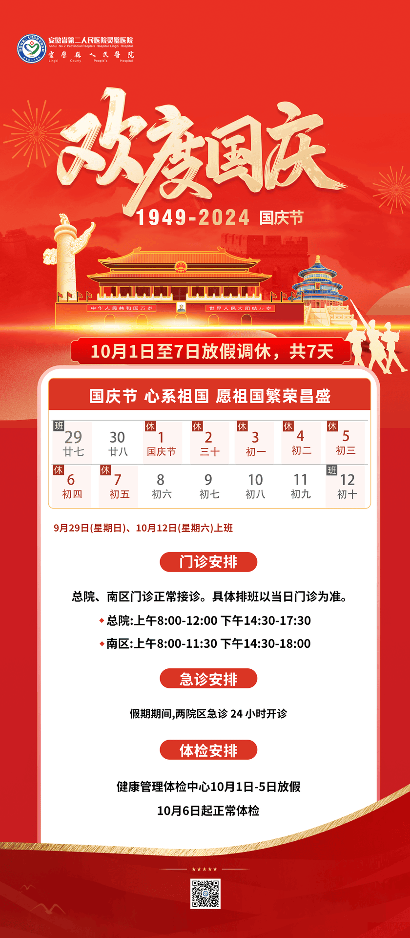 安徽省第二人民医院灵璧医院(灵璧县人民医院)2024年国庆节假期门、急诊及体检安排