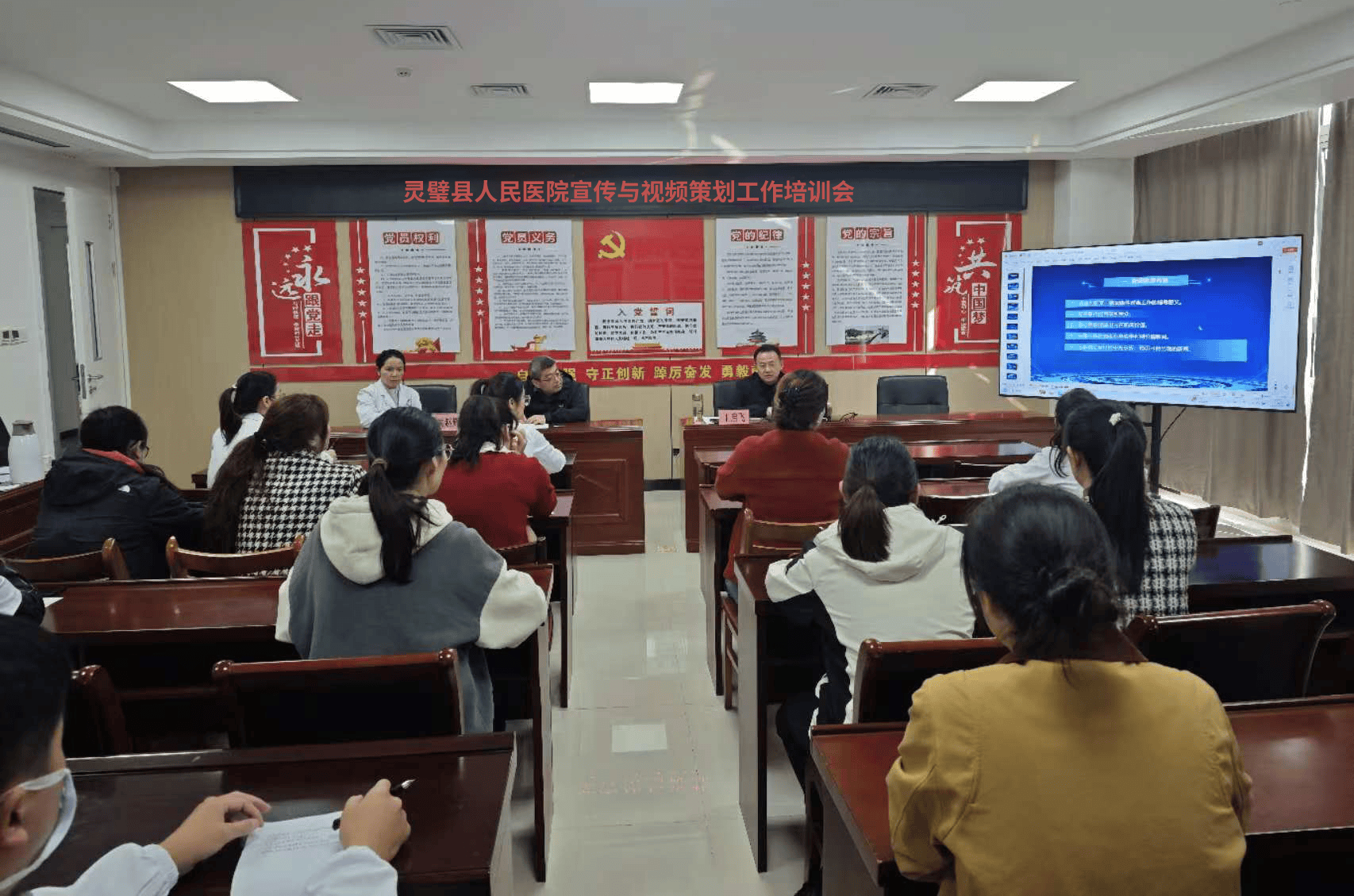 本次培训特别邀请灵璧县融媒体中心全媒体发展部王启飞主任进行授课指导。王启飞主任围绕新闻这一核心主题,深入剖析了新闻敏感、新闻价值、以及网络舆情等多个关键方面。在网络短视频的策划与制作主题上,更是详细阐述了机遇与挑战、策划选择、制作要素以及器材与软件使用等丰富内容。讲解过程中,王启飞主任通过大量生动的案例,使抽象的理论知识变得通俗易懂,让大家对宣传工作有了更清晰、更深入的认识。大家纷纷表示这次培训对提升医疗新闻撰写和摄影水平有很大帮助,要把此次学到的知识用到今后的具体实践中,争取创作出更多更好的作品。
