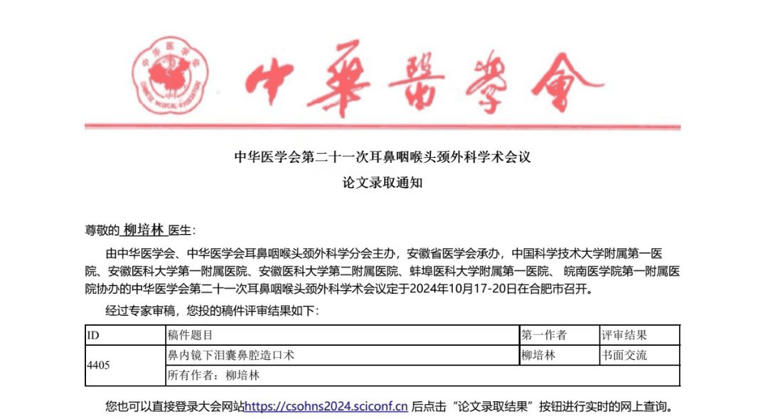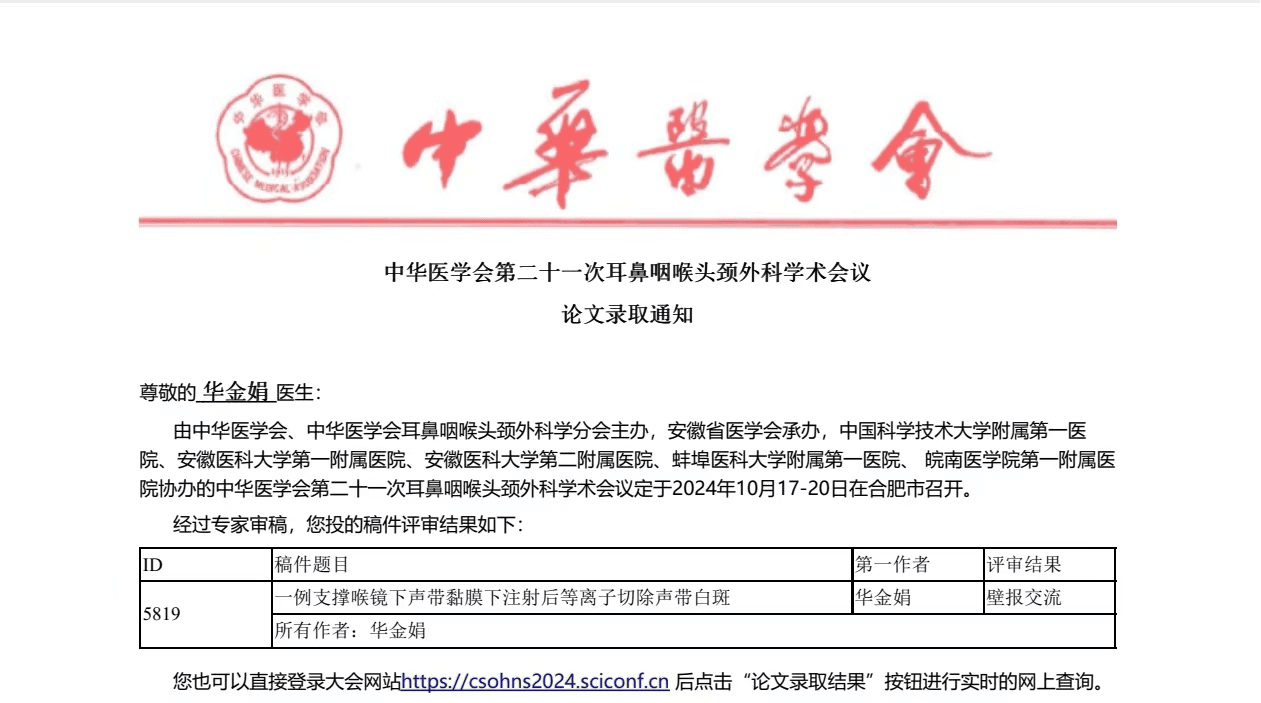 我院耳鼻喉科柳培林主任撰稿的《鼻内镜下泪囊鼻腔造口术》、华金娟医生撰稿的的《一例支撑喉镜下声带黏膜下注射后等离子切除声带白斑》,被中华医学会第二十一次耳鼻咽喉头颈外科学术会议录用,并在大会上展示和交流。这表明我院在耳鼻咽喉专科的手术治疗方面取得了显著的疗效。据了解,本次学术会议,我院是全市唯一县级医院有论文录用单位。