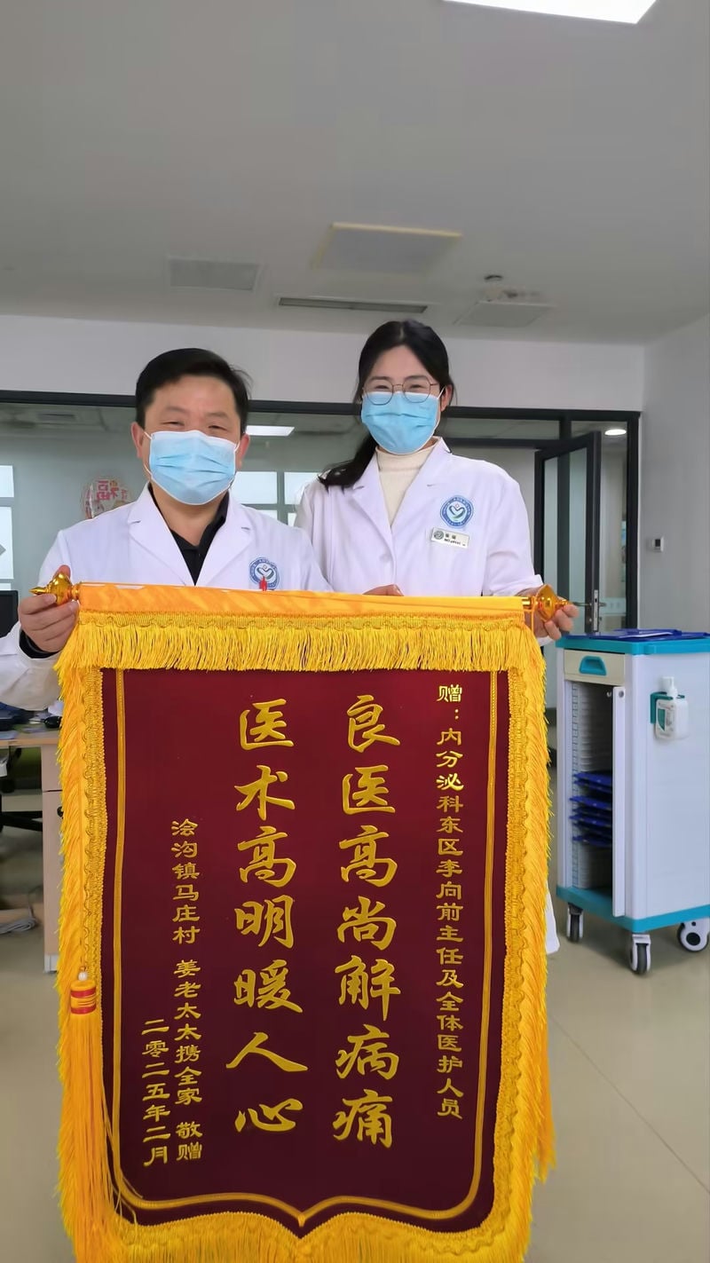 2月24日,我院普外二科收到一面患者及家属赠送的锦旗,一面锦旗,传递的不仅是患者及家属的感激之情,更是对医务人员的信赖和肯定。据悉,患者为一名老年男性,因十二指肠腺癌在上海医院行“胰十二指肠根治术”,现病情平稳,为方便治疗来我院住院,经过科室医疗团队积极的诊疗以及暖心的护理,患者恢复情况较好,特在出院之际为科室送上锦旗。