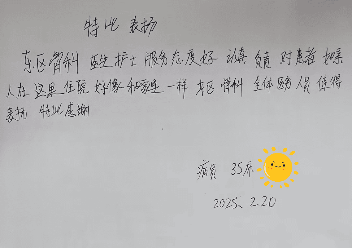 2月20日,我院骨科东区收到一面患者送的锦旗和一封手写的表扬信。据了解,李阿姨因右侧股骨粗隆间骨折入院,经过手术治疗,术后恢复良好,现已康复出院。这面锦旗是患者及家属对我院医护人员精湛医术和辛勤付出的高度认可。
