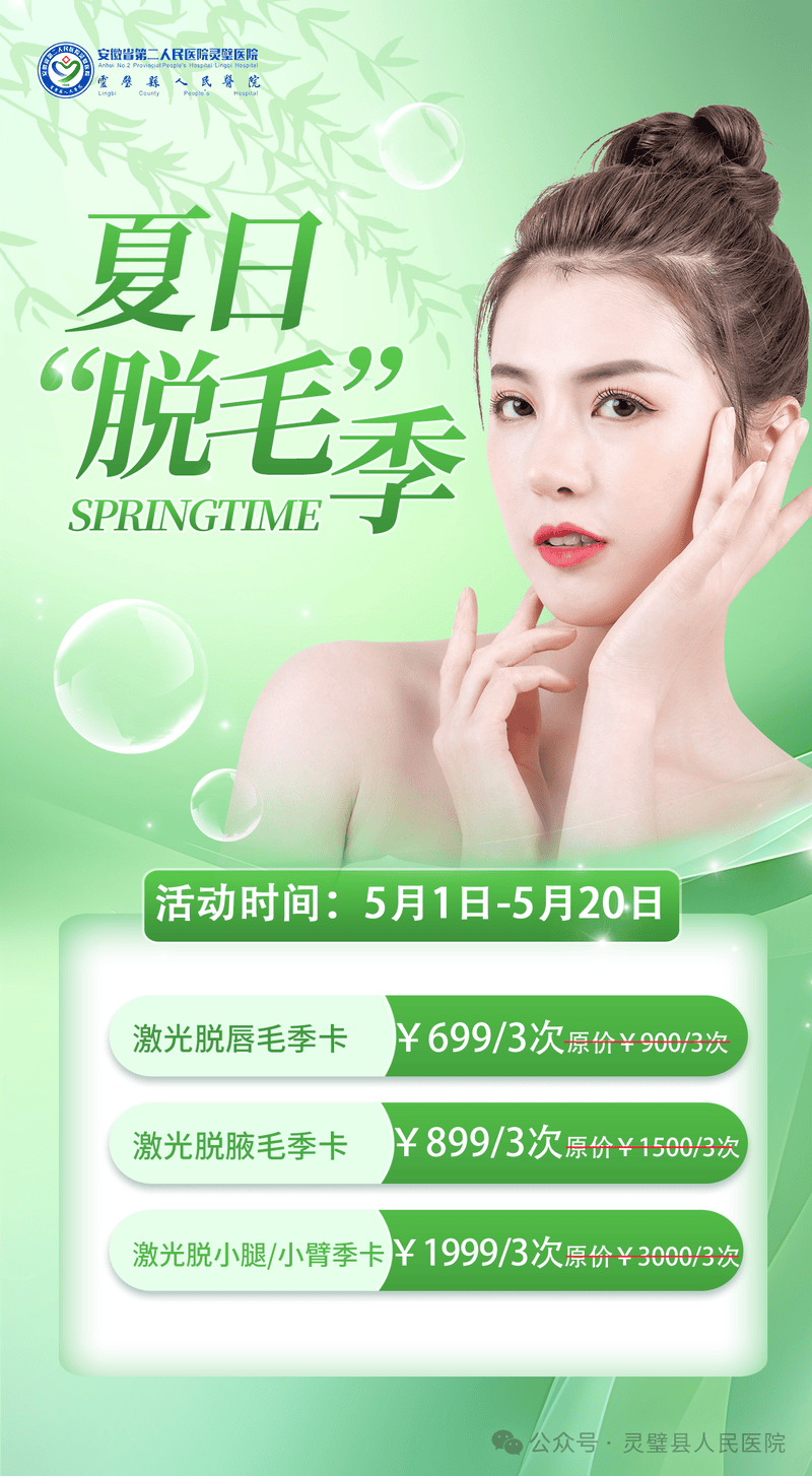 夏天的脚步越来越近!是时候和恼人的毛发说拜拜,以光滑美肌迎接夏日啦~安徽省第二人民医院灵璧医院皮肤科和整形美容科为大家带来专属福利 ——夏日“脱毛”季活动正式开启! 咨询电话:0557 - 6880422 / 18855769195 地址:灵璧县人民医院门诊三楼皮肤科诊区 客服微信 赶紧行动起来,在这个夏天 “脱” 颖而出,绽放自信光彩!