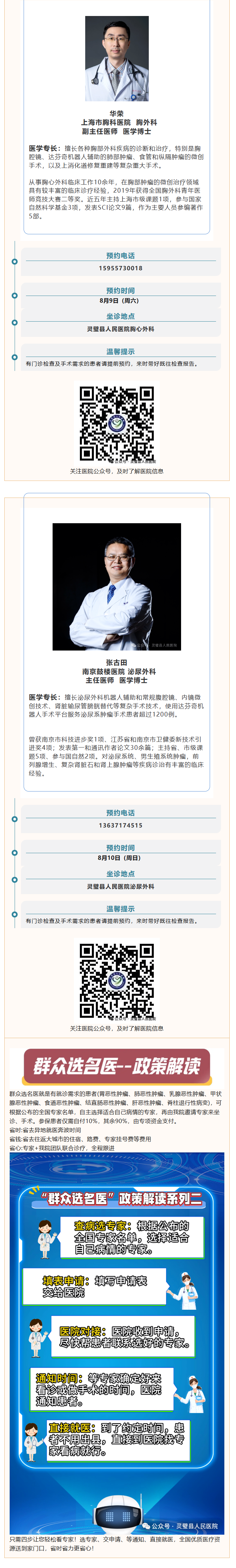 沪宁名医齐聚周末!8月9日上海市胸科医院胸外科华荣主任、8月10日南京鼓楼医院泌尿外科张古田主任来我院坐诊手术