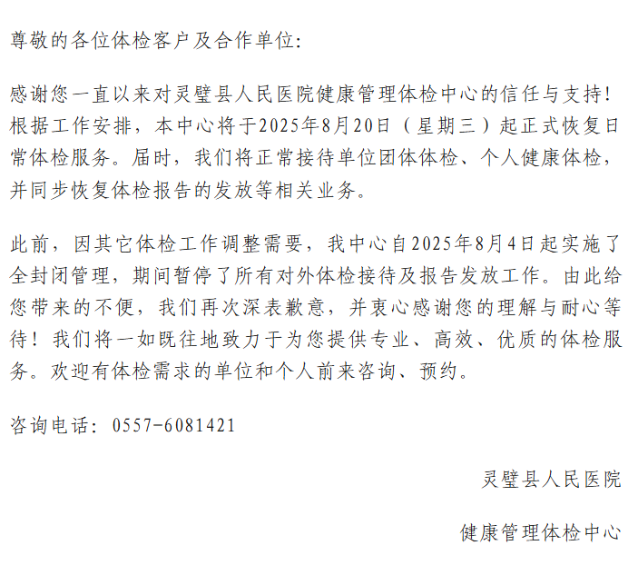 灵璧县人民医院体检中心将于8月20日恢复体检业务的通知