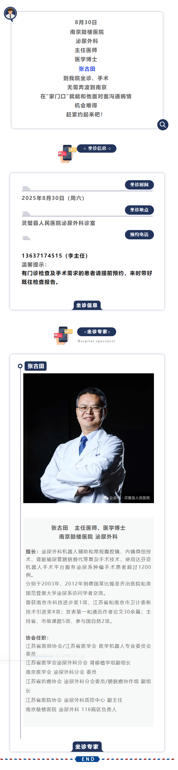 家门口看名医!8月30日南京鼓楼医院泌尿外科专家张古田来我院坐诊、手术