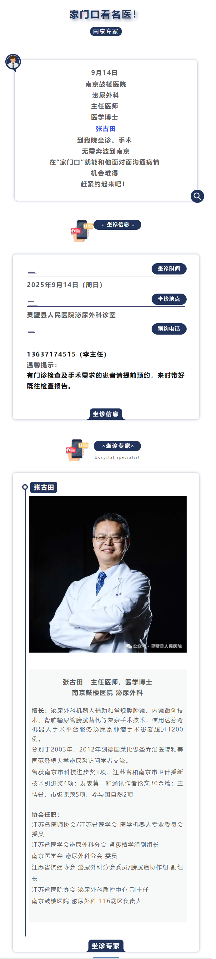 家门口看名医!9月14日南京鼓楼医院泌尿外科专家张古田来我院坐诊、手术