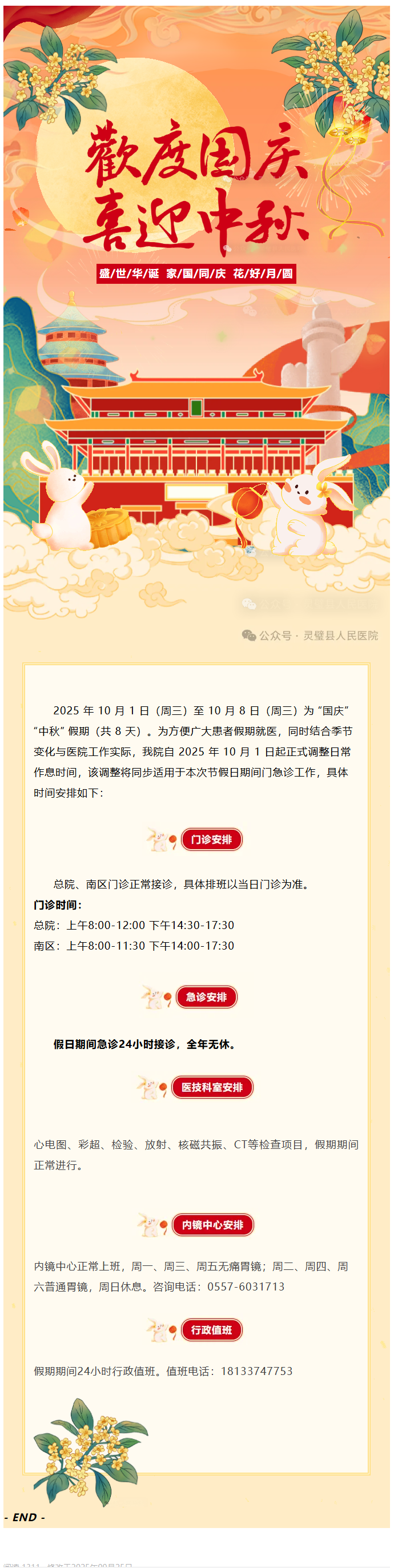 灵璧县人民医院 2025 年 “国庆”“中秋” 假期门急诊工作安排及作息时间调整通知