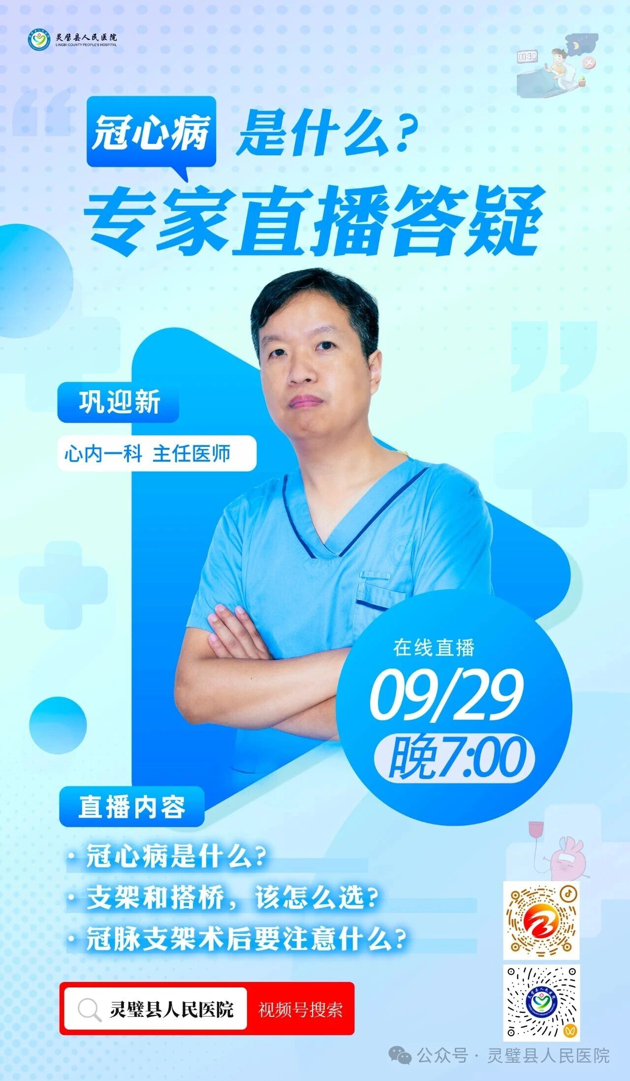 直播预告| 9月29日晚7点,灵璧县人民医院巩迎新主任为您在线科普冠心病的防治与治疗选择