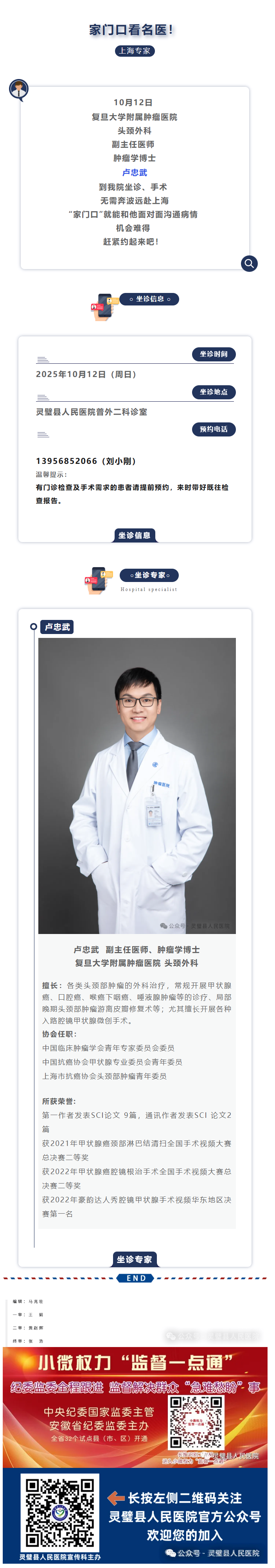优质医疗资源下沉到县医院!10月12日复旦大学附属肿瘤医院头颈外科专家卢忠武来我院坐诊、手术