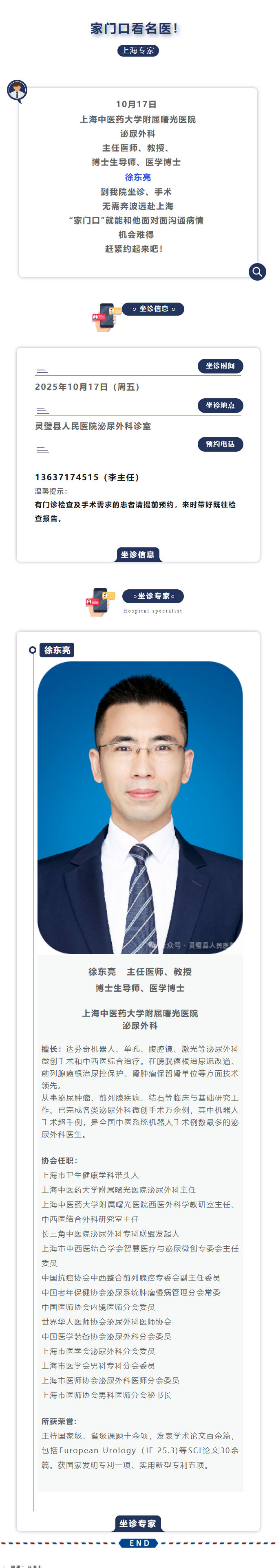 精准对接群众需求!10月17日,特邀上海曙光医院泌尿外科大咖徐东亮教授来院,疑难手术本地解决