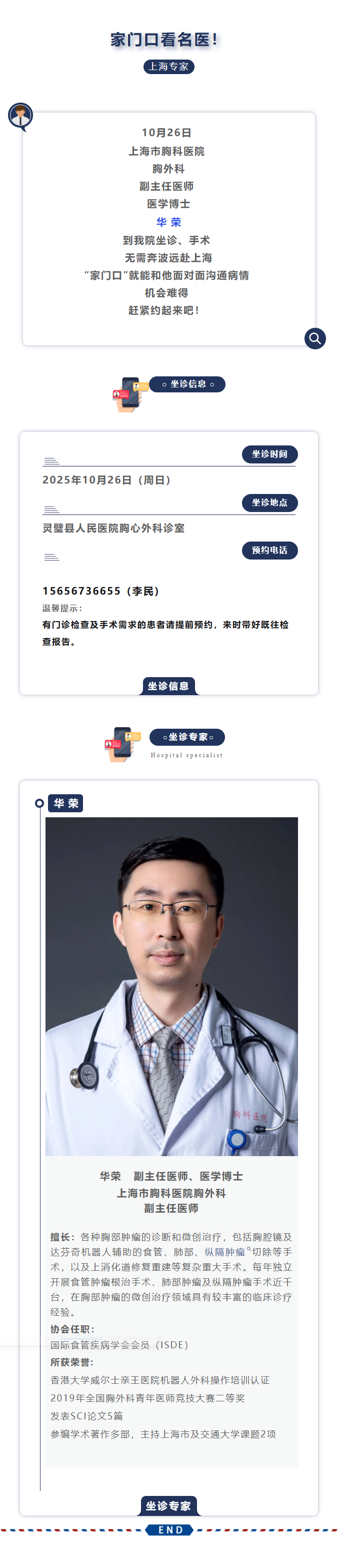 不用抢上海专家号!10 月 26 日,上海胸科医院华荣博士来我院坐诊、手术