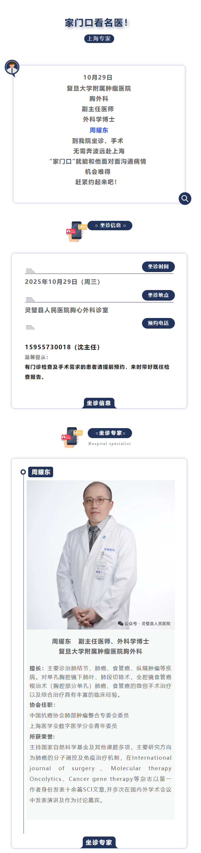 不用跑上海!10月29日复旦大学附属肿瘤医院胸外科“大咖”周耀东来我院坐诊、手术