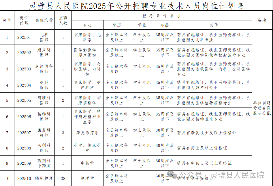 本次招聘面向社会公开招聘专业技术人员51名。具体岗位及条件见附件《灵璧县人民医院2025年公开招聘专业技术人员岗位计划表》。