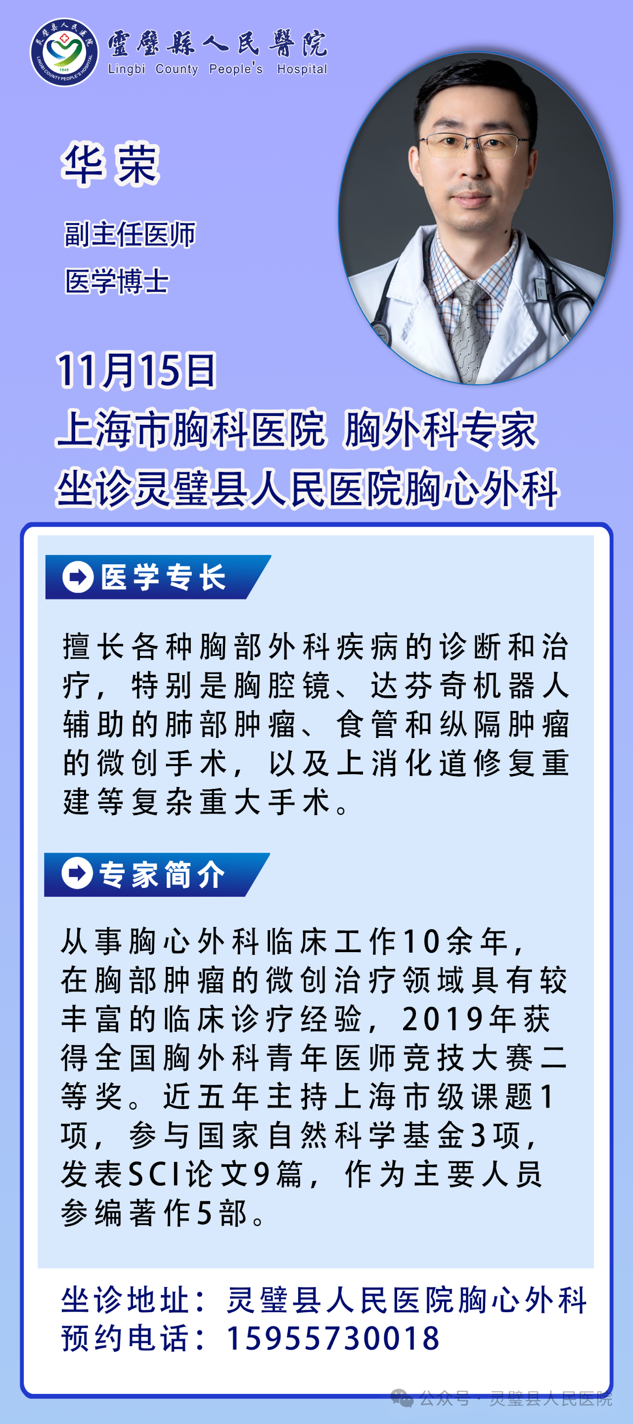 看病不用东奔西跑!11月15日,上海市胸科医院专家华荣来我院坐诊、手术
