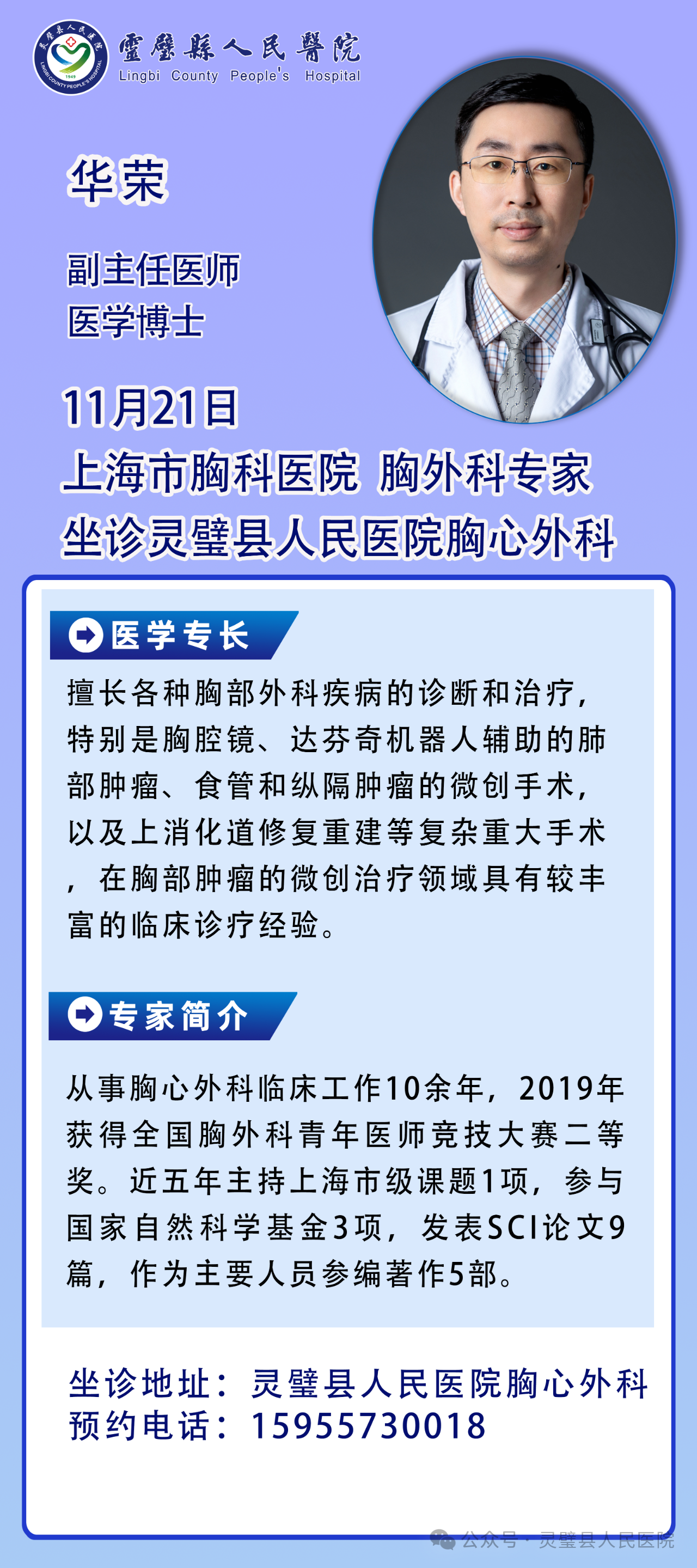 足不出县看上海名医! 11 月 21 日上海胸科医院华荣专家来我院坐诊、手术