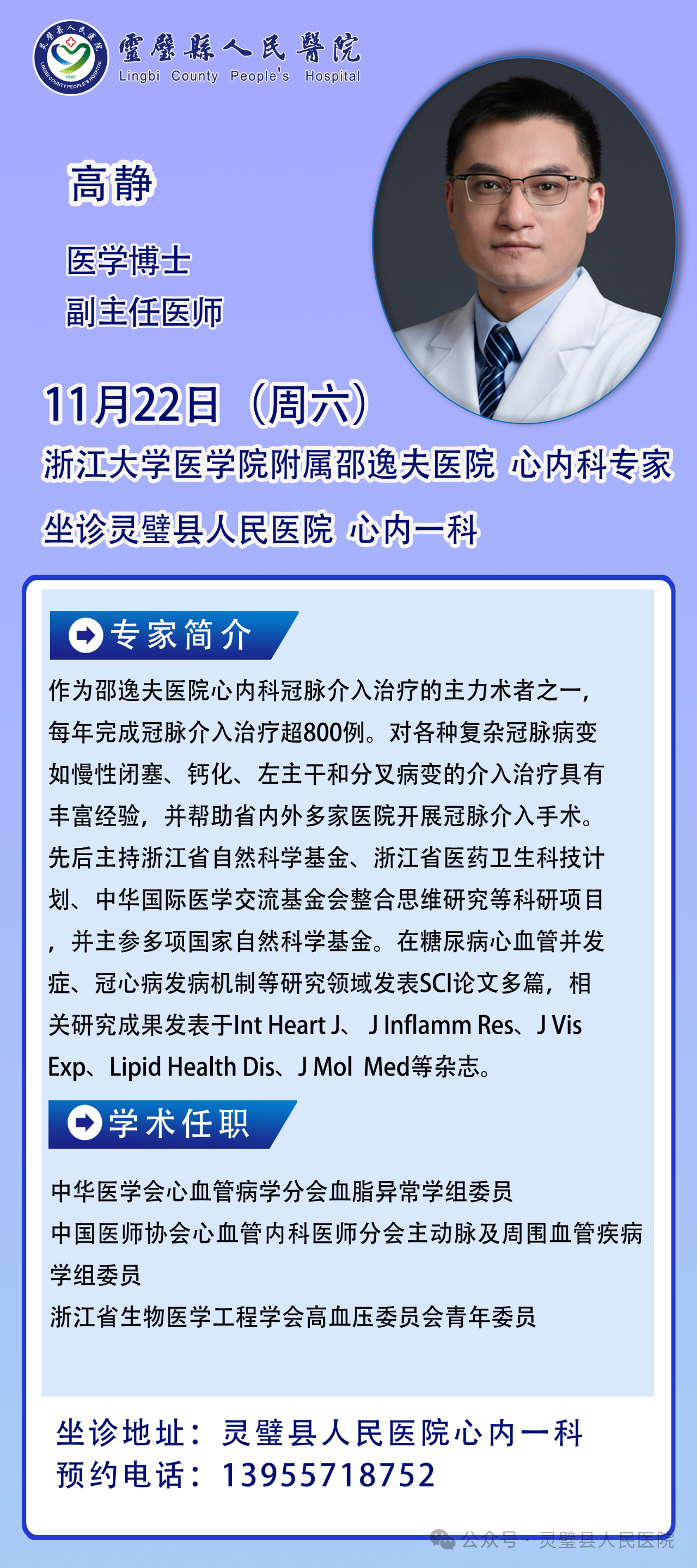专攻复杂冠心病 和心梗介入!浙大邵逸夫心内科高静博士,11 月 22 日来我院坐诊、手术