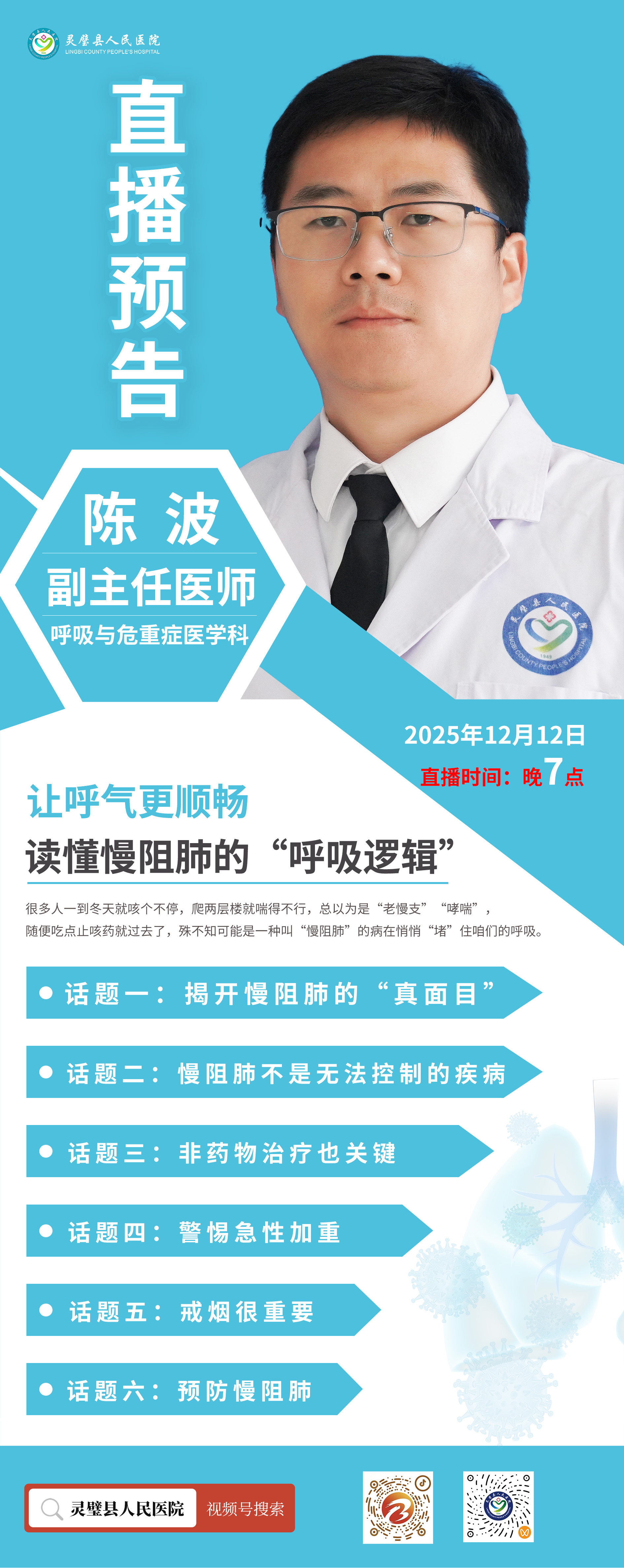 冬天咳不停、爬楼喘?12月12日 晚 7 点!灵璧县人民医院陈波主任揭秘慢阻肺的 “呼吸逻辑”