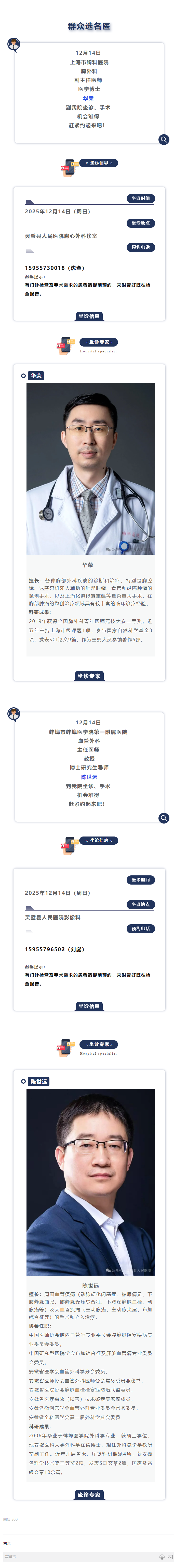 沪皖名医齐聚!上海胸科医院华荣 、 蚌医一附院陈世远 ,12 月 14 日来我院坐诊手术,预约从速!