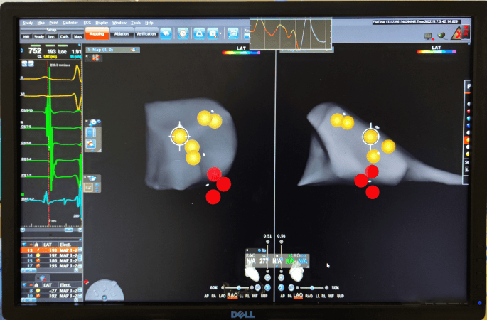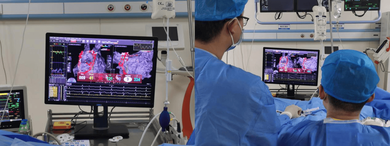 此次手术在局麻下进行,通过患者大腿根部的股静脉将导管送入心脏,利用标测技术找到异常位点,进而通过导管头端释放能量将异常位点消除,从而阻断异常通路,防止心动过速继续发作。手术历时60分钟顺利完成,患者无不适,后续恢复良好。该手术由心内科医师彭祥武和朱浩独立完成。