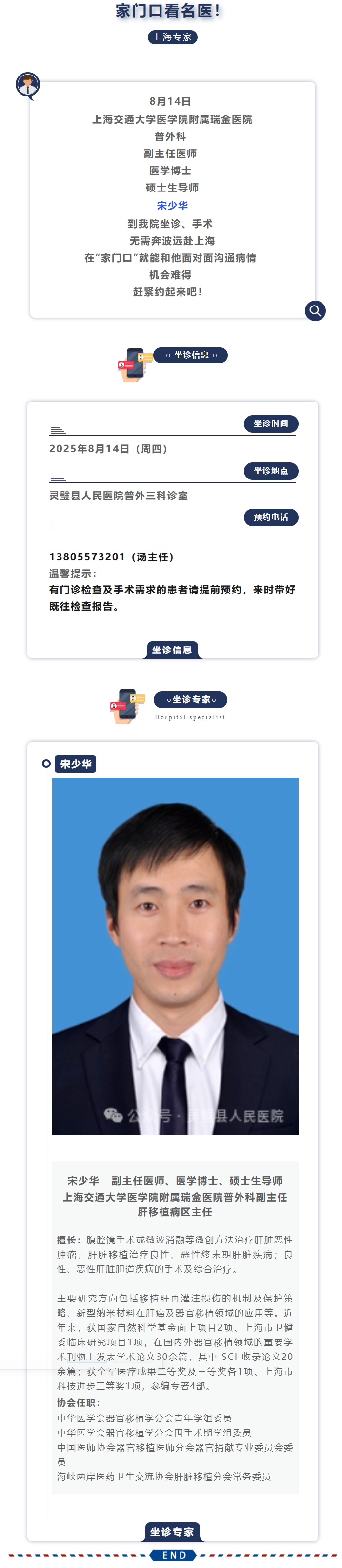 家门口看名医!8月14日,上海交通大学医学院附属瑞金医院普外科 宋少华来我院坐诊、手术